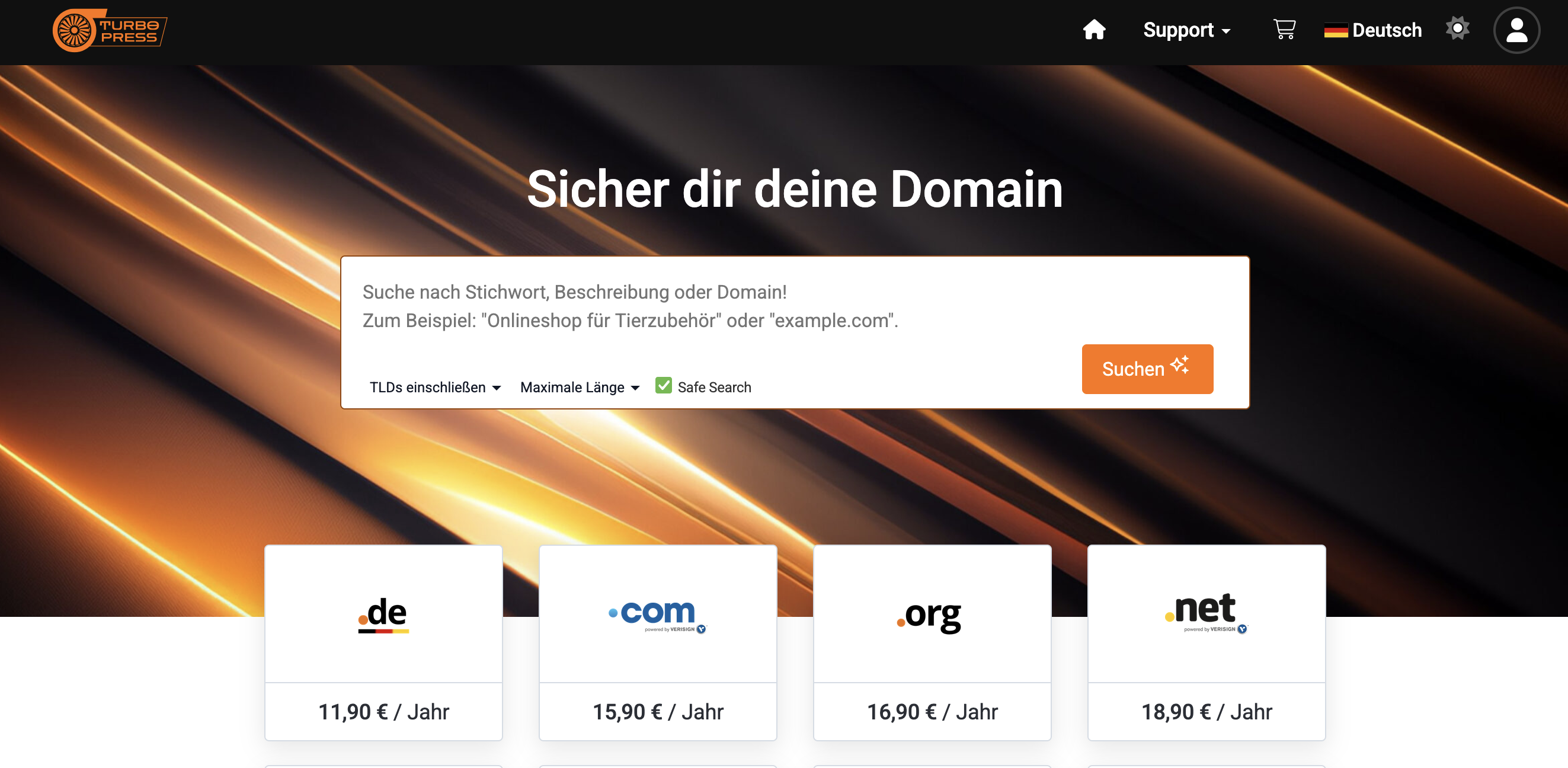 Um eine neue Domain bei turbopress zu registrieren, nutze unseren Domain Checker.