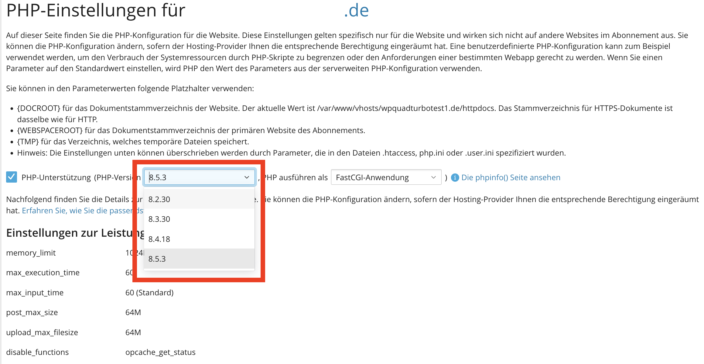 Du kannst die PHP-Version deiner Website direkt in Plesk anpassen.