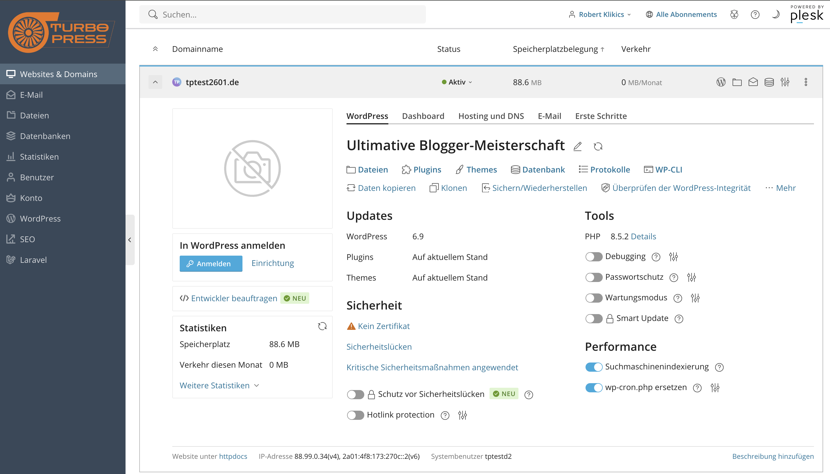 Plesk ist das Kontrollzentrum deines turbopress Hostings.