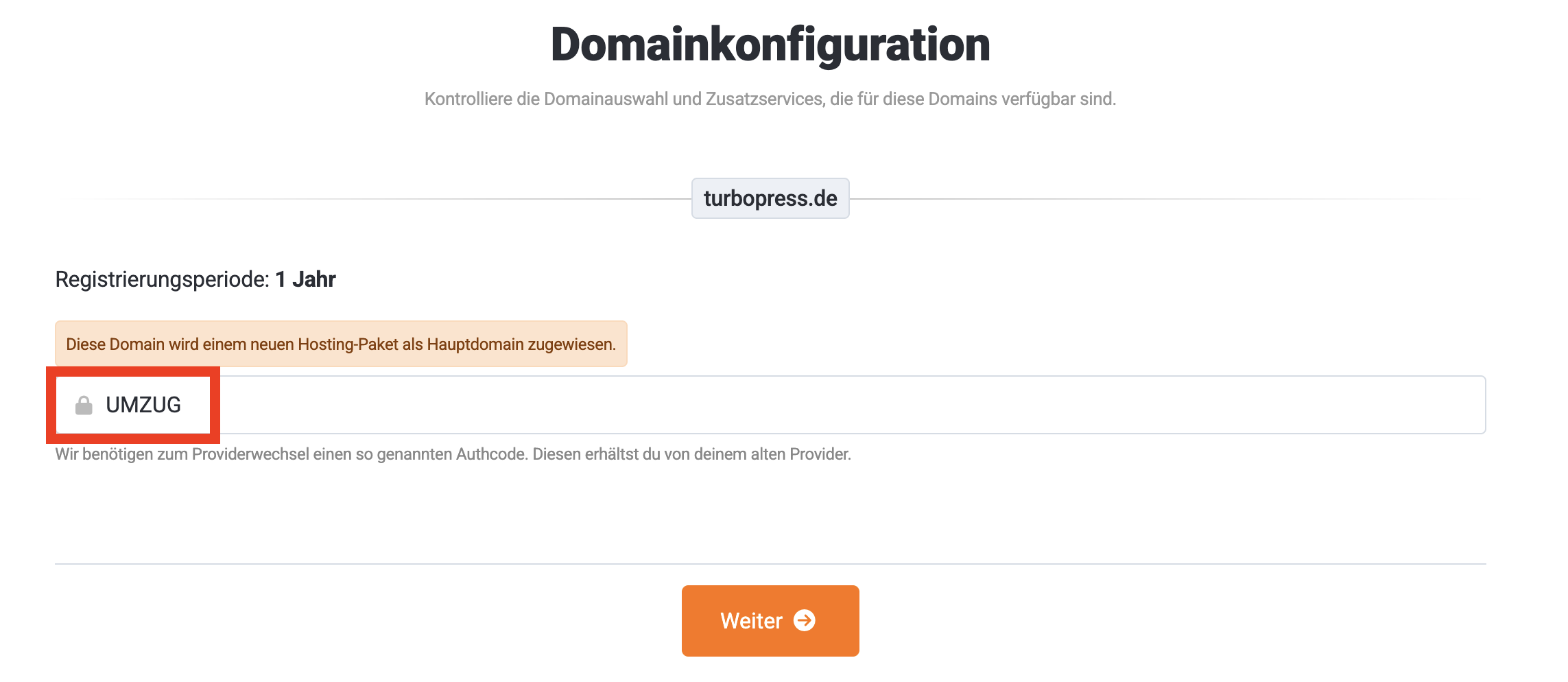 Wichtig: Bitte geben im nächsten Schritt unter EPP/Authcode nicht den richtigen EPP/Authcode ein, sondern tippe in das Feld: UMZUG