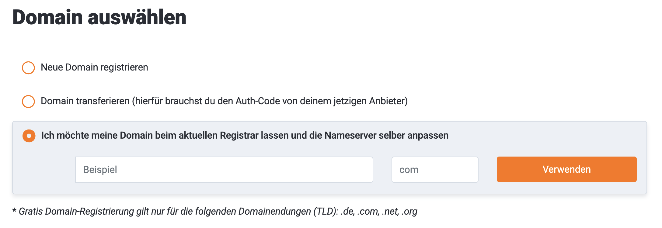 Wenn deine Domain bei deinem bisherigen Anbieter bleiben soll, bestellst du das ein Hosting-Paket und gibst an, dass du deine Domain beim aktuellen Registrar lassen möchtest: