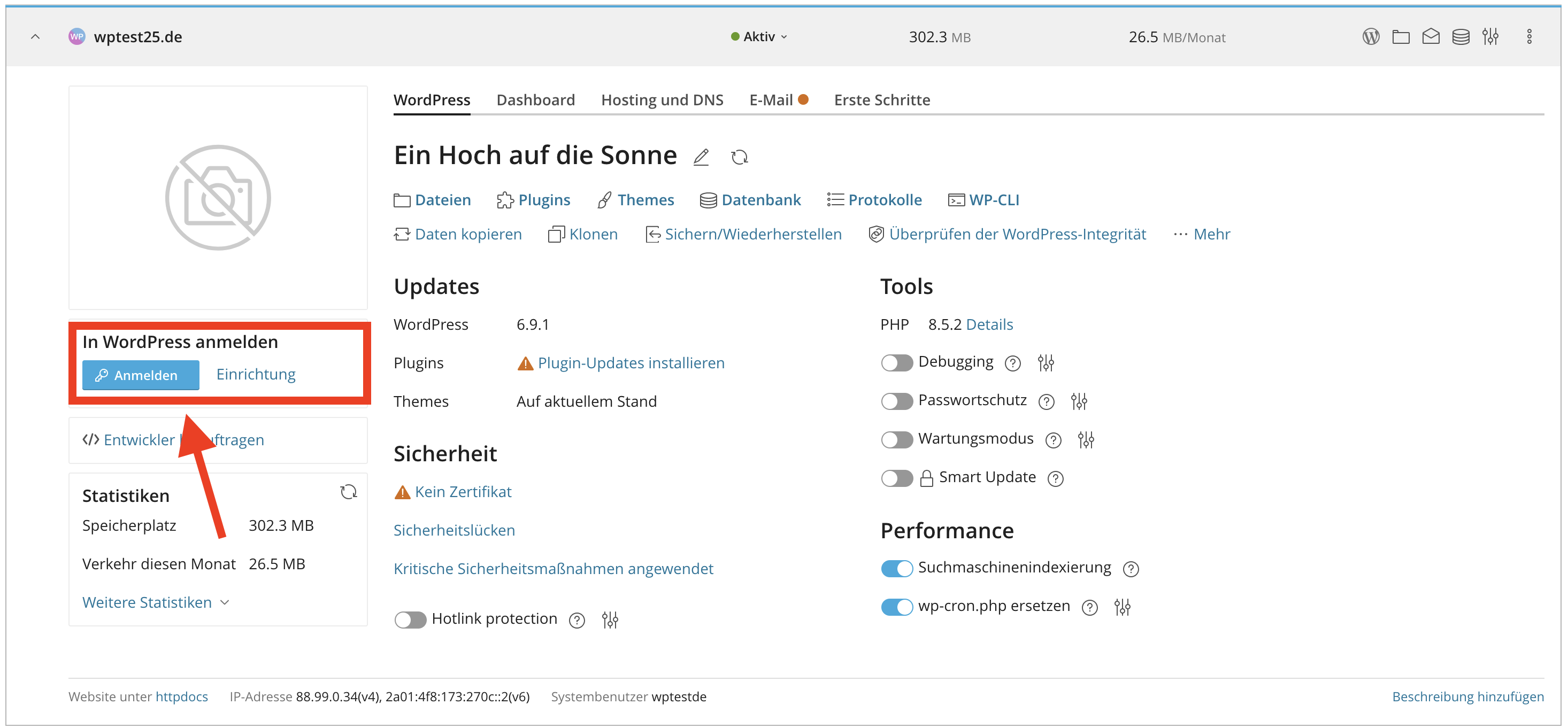 Wähle „In WordPress anmelden“ und beginne mit der Erstellung deiner Website in WordPress.