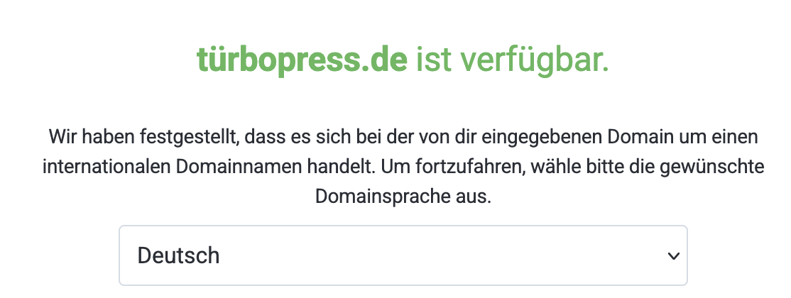 Du wirst bei Eingabe von Umlauten oder Sonderzeichen bei der Domainsuche dann aufgefordert, die Sprache zu wählen, in der die Domain geschrieben ist: