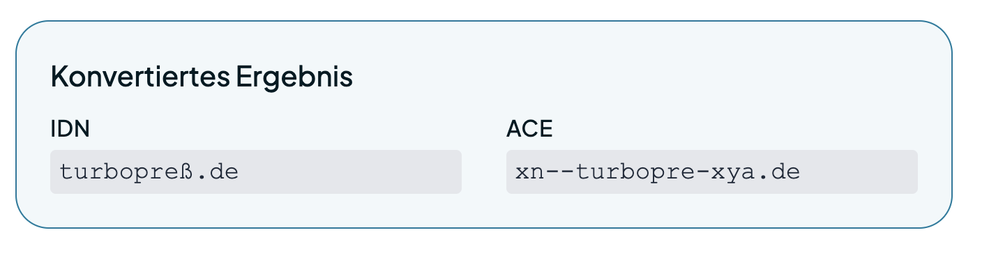 Als Lösung kann man die Domain vorab in das ACE-Format konvertieren (Konverter auf denic.de), womit dann turbopreß.de zu xn--turbopre-xya.de wird. Mit xn--turbopre-xya.de klappt dann auch die Domainregistrierung bei turbopress!