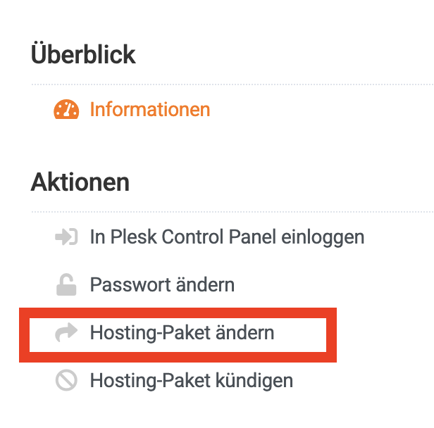 Hinweis: Downgrades auf Hosting-Pakete mit weniger Speicherplatz als in deinem vorhandenen Paket sind nur auf Anfrage beim Support möglich. Damit wollen wir sicherstellen, dass dein Hosting nicht automatisch gesperrt wird, wenn du auf einen kleinen Tarif wechselst, aber mehr Speicher belegt hast!