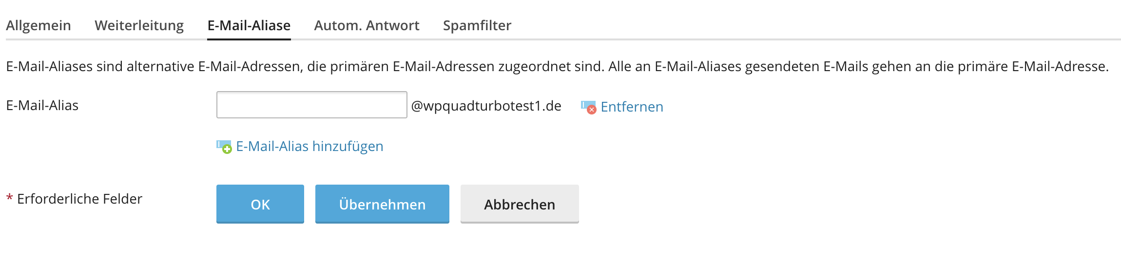 Ein E-Mail-Alias ist eine zusätzliche Adresse, die E-Mails an ein bestehendes Postfach weiterleitet. Es wird kein eigenes Postfach erstellt.